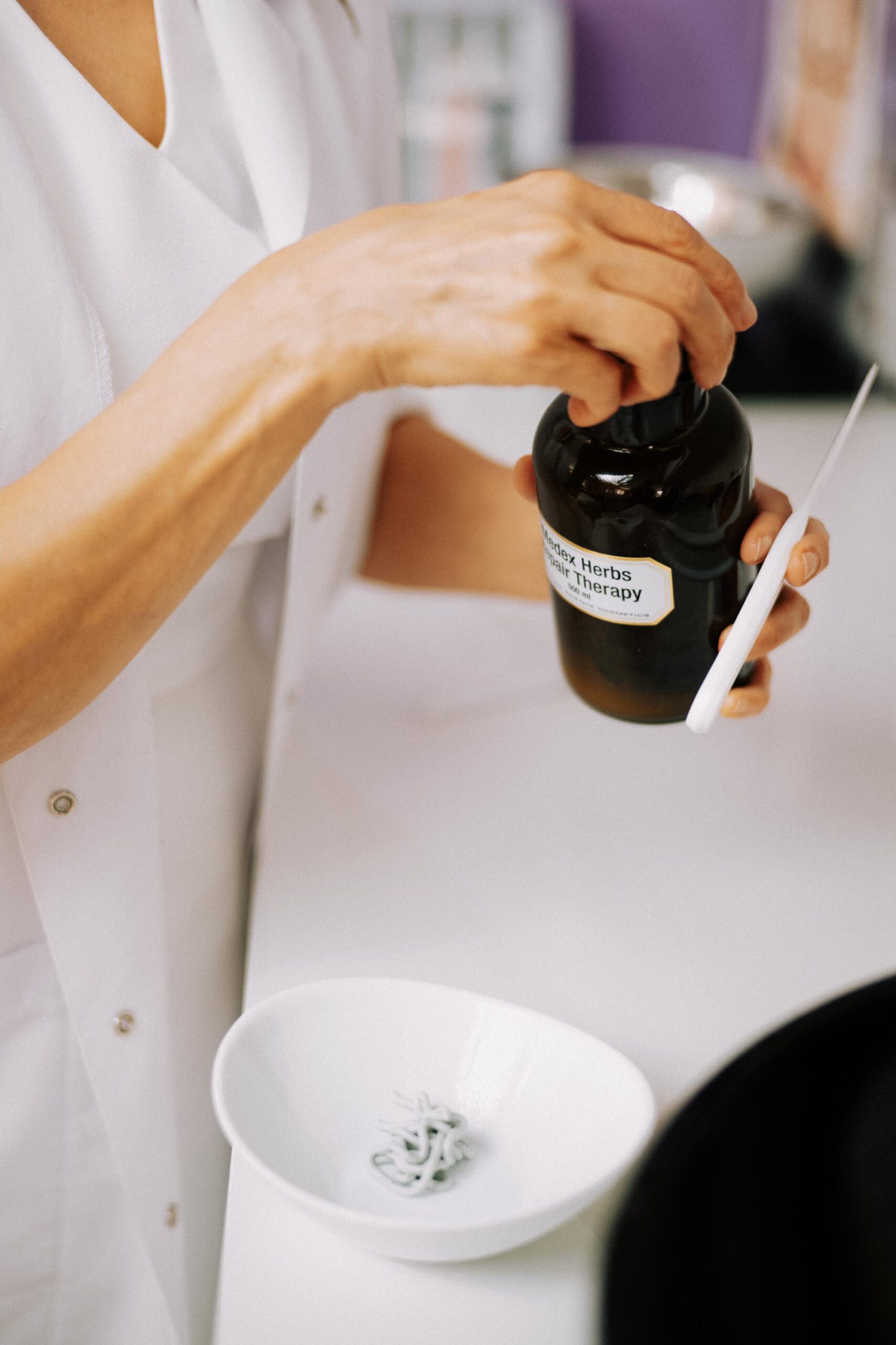 Wir haben im Studio mit natürlichem Licht und einem einzigen Blitz gearbeitet – genug, um dem Raum Struktur zu geben, ohne die Wärme zu nehmen. Fotografiert wieder mit der Leica M10 und dem Voigtländer Nokton 50mm f1.4. Diese Kombination liefert genau den Look, den Ayses Arbeit braucht: weich, nah, nie überinszeniert. Die Serie wechselt zwischen Porträts, die ihren Charme einfangen, Detailaufnahmen der Produkte in der Anwendung, Spiegelbildern und einem Moment draußen mit Lavendel und geschlossenen Augen. Bilder, die zeigen, wie sich ein Besuch bei Ayse anfühlt – nicht nur, was dort passiert.